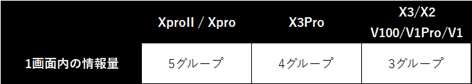 ※X3は3グループといったが、直下に別の項目があり、3グループ表示すると、ふとした拍子に画面が動いてしまい表示が見切れてしまう。実際に安定して1画面固定で使うなら2グループまでだろうと思う。