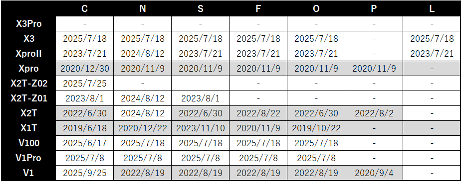 この表は2025/10/4時点でのGodoxサポートページで最後にファームウェアが更新された日をまとめたものだ。公式にはいつまでサポートすると書かれたものは見つからなかったが2023年より古いものをグレーにしている。