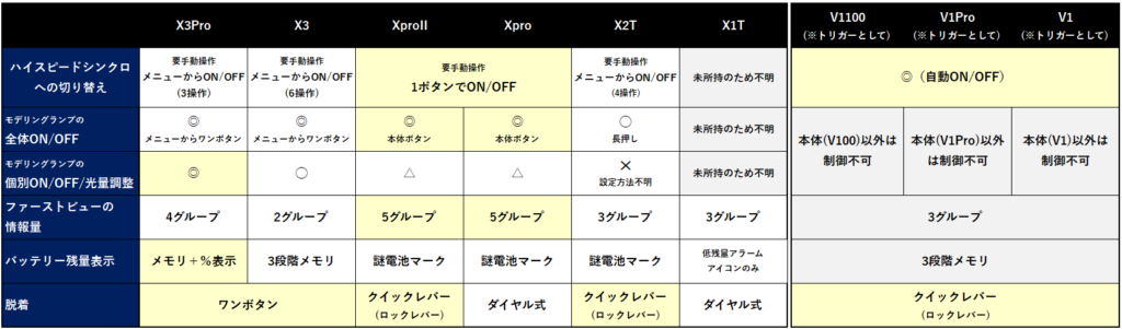 ※V1ProやV1はトリガーとして使う場合、4グループとあるがMは取り付けているストロボ自体のため実際はA/B/Cの3グループしか制御できない点に注意が必要。V100は一つ増えてA~Dの4グループが制御できる。