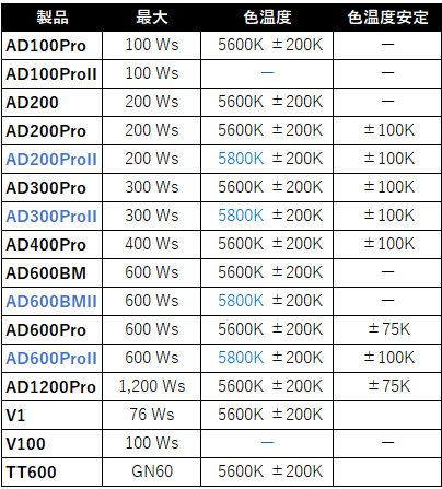 旧型は5600Kベース、新型は5800Kベースのようだが、AD100ProIIや、V100などの新型ストロボでは仕様書上から色温度に関する表記が消えてしまっている。書けるレベルではなかったのか、ただ記載漏れなのかはわからない…。