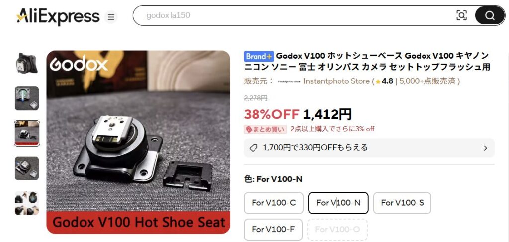 アリエクで「Godox V100」 + 「シュー」と検索すると交換用のパーツがずらっとでてきた。価格は1つあたり送料含めて1500円前後と思いのほかリーズナブルだった。